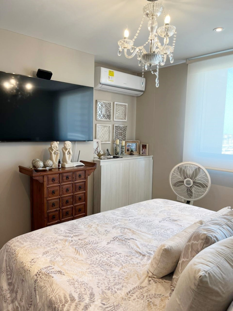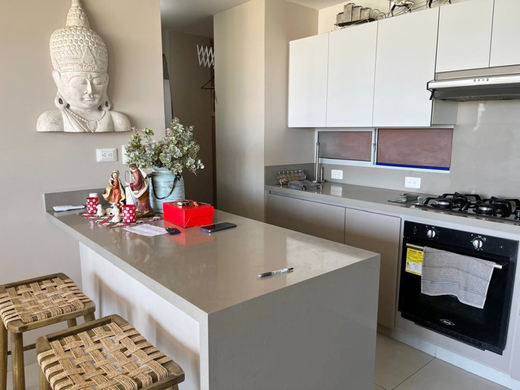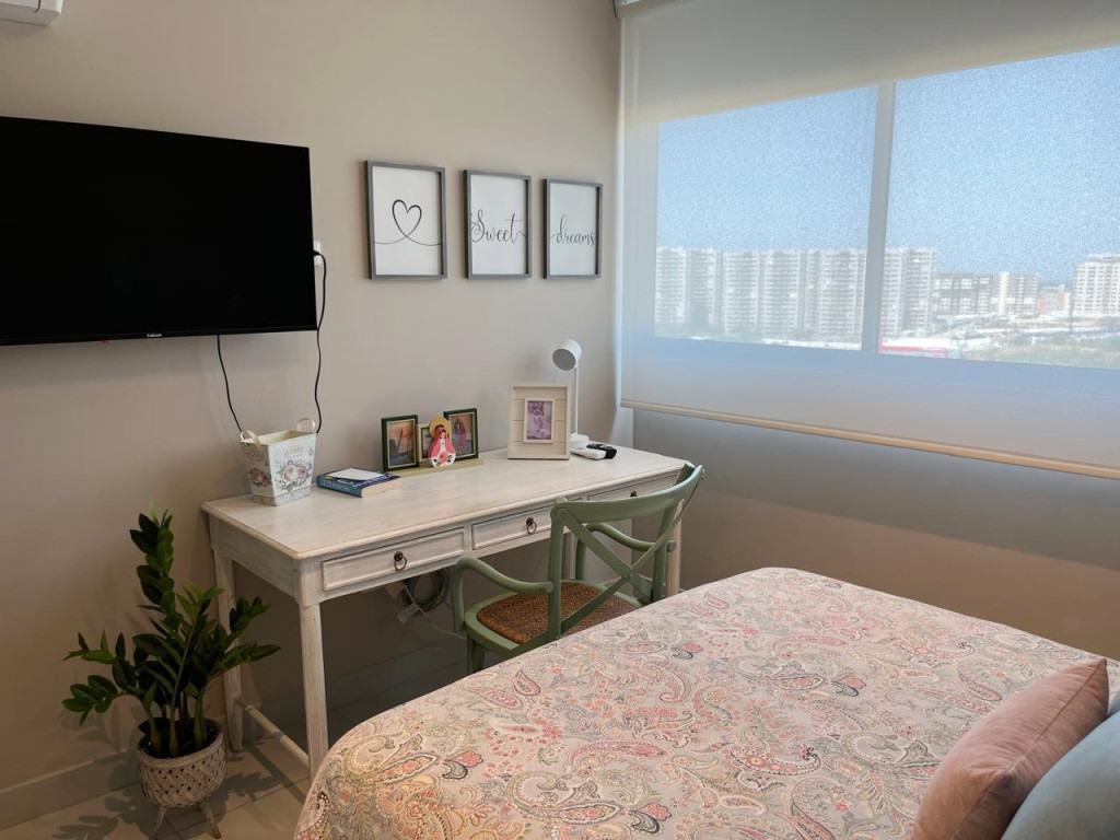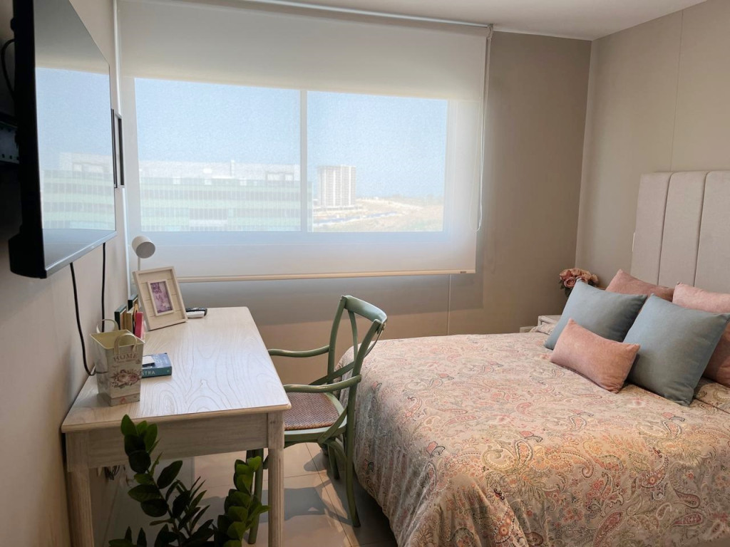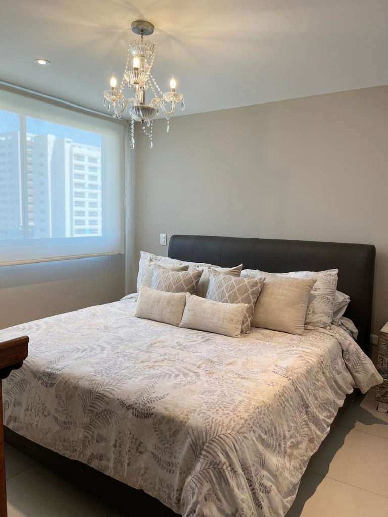 Confortable apartamento de 122 M2 ubicado en lado sombra, consta de sala comedor, balcón, tres habitaciones cada una con baño privado, baño social, cocina integral, cuarto y baño de servicio, y área de labores; cuenta con dos parqueaderos y depósito. El conjunto residencial dispone de completas zonas sociales: planta eléctrica, piscina, zona de juegos infantiles, zona BBQ, salón social, sauna, baño turco, parqueadero de visitantes. Ubicado en Portal de Genovés.