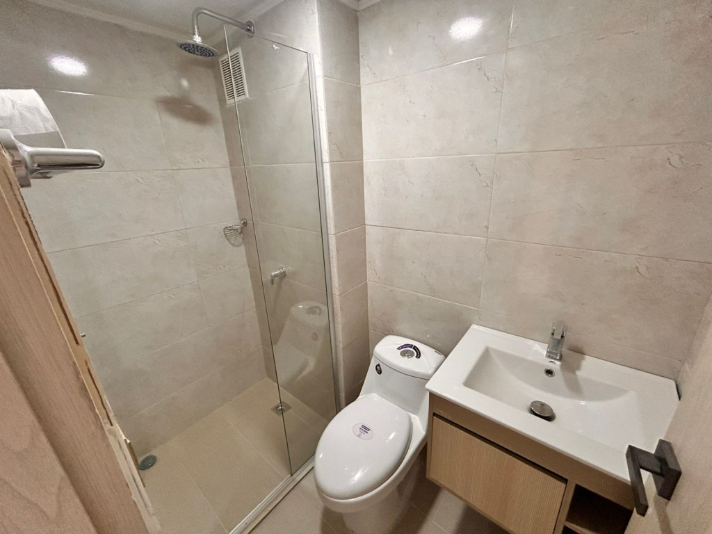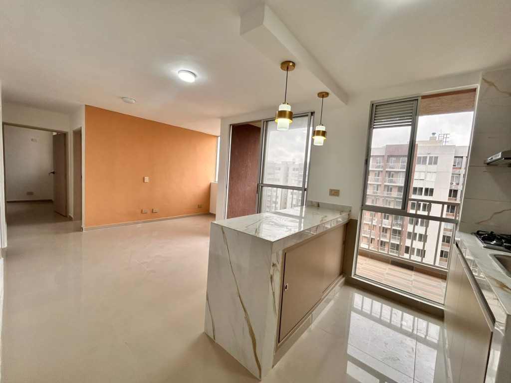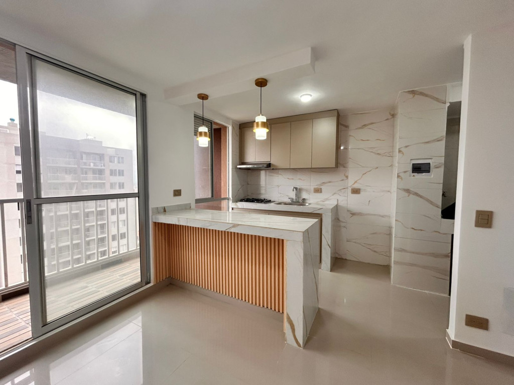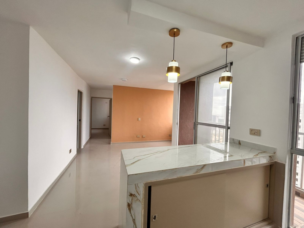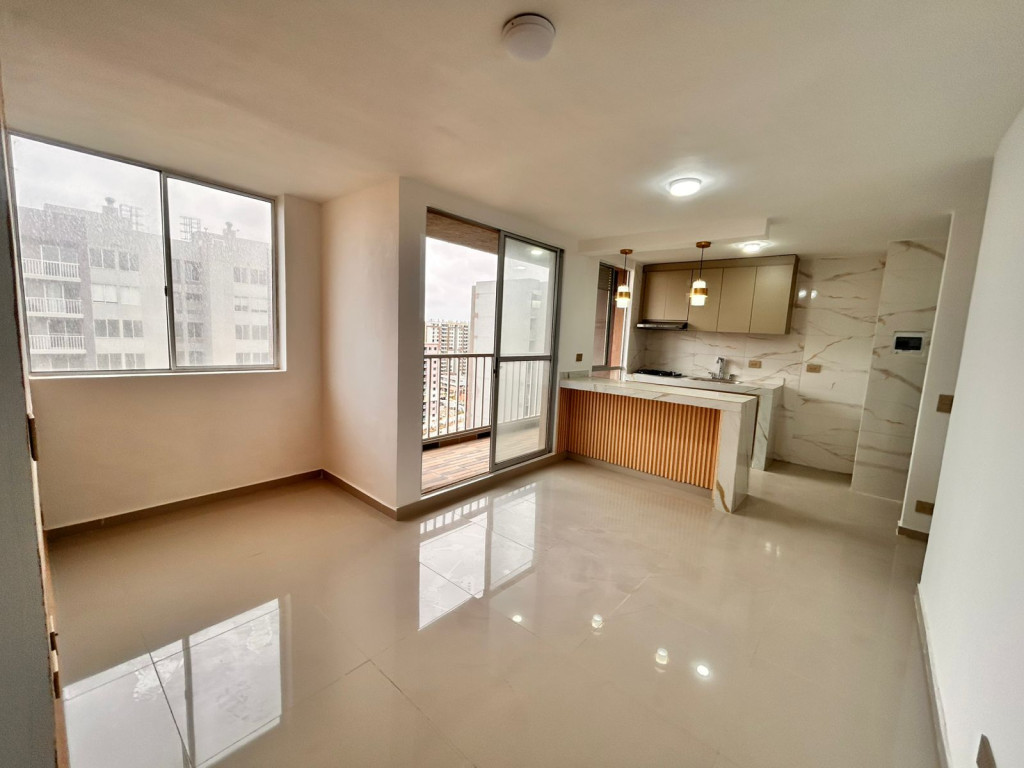 Apartamento para estrenar en conjunto residencial, con control de acceso y vigilancia. Presenta acabados modernos y distribución funcional. Cuenta con sala-comedor de concepto abierto, cocina integral con pantry y zona de labores independiente. Dispone de dos habitaciones: alcoba principal con baño privado y una habitación auxiliar. Baños con divisiones en vidrio. Incluye balcón amplio. Ubicado en piso 16, con iluminación natural y ventilación constante.